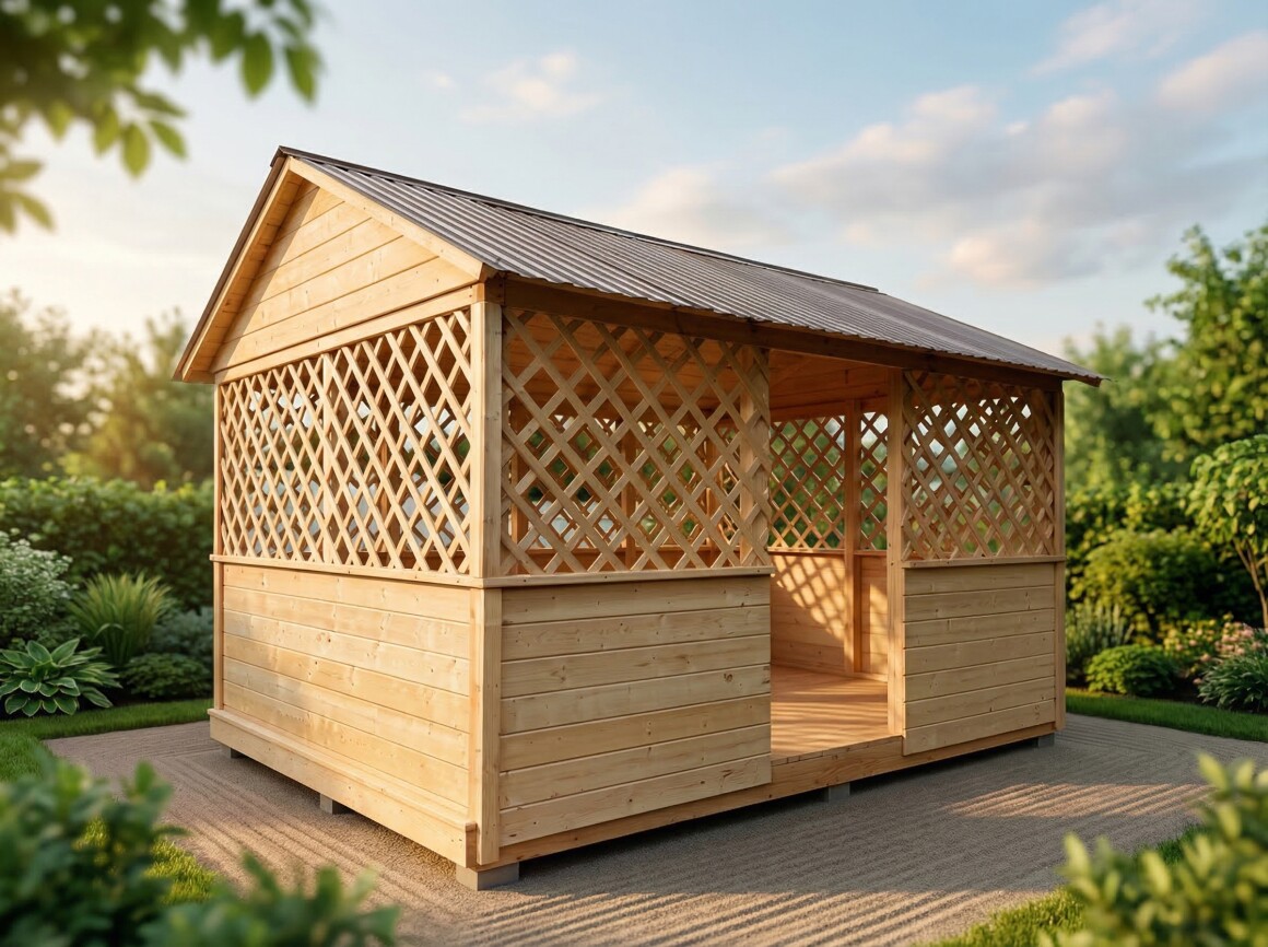 Беседки в стандартном исполнении: низ зашит решеткой. Беседка поставляется без окраски. Решетки в комплекте.
