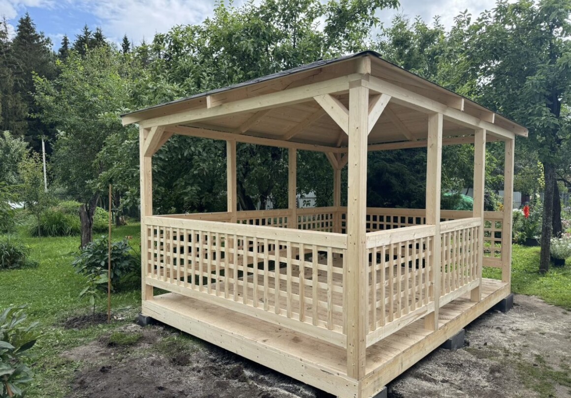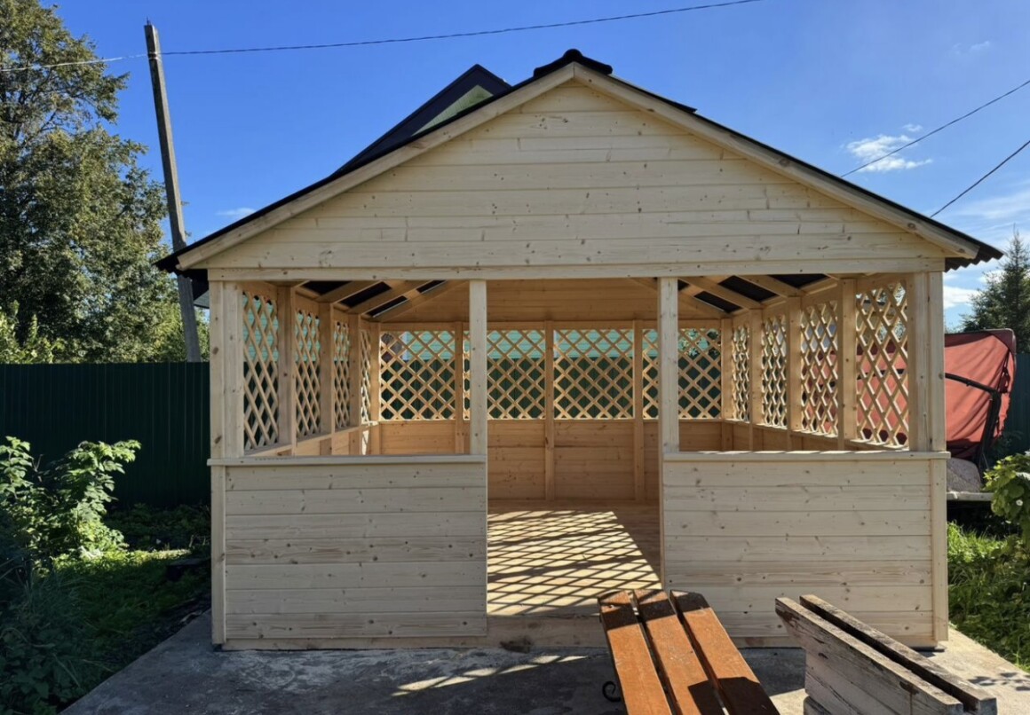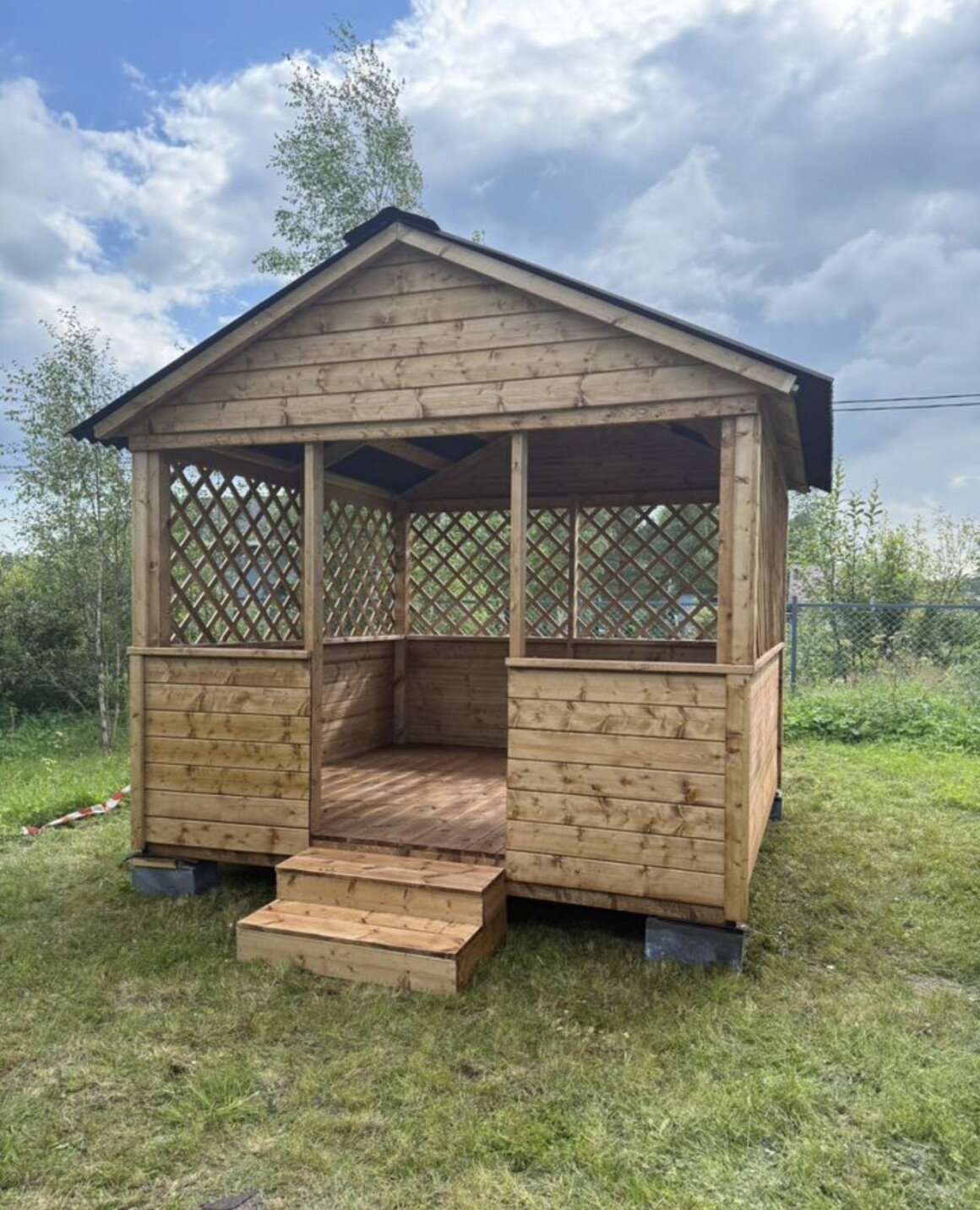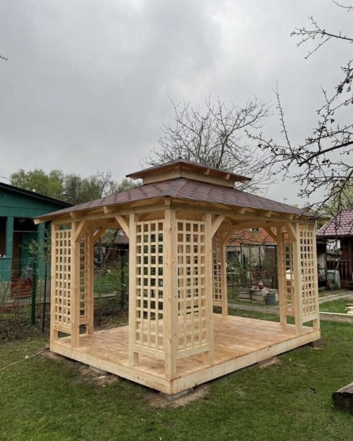 Беседки в стандартном исполнении: низ зашит решеткой. Беседка поставляется без окраски. Решетки в комплекте
