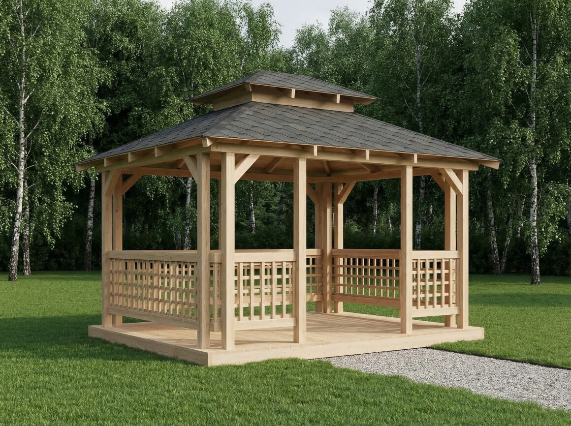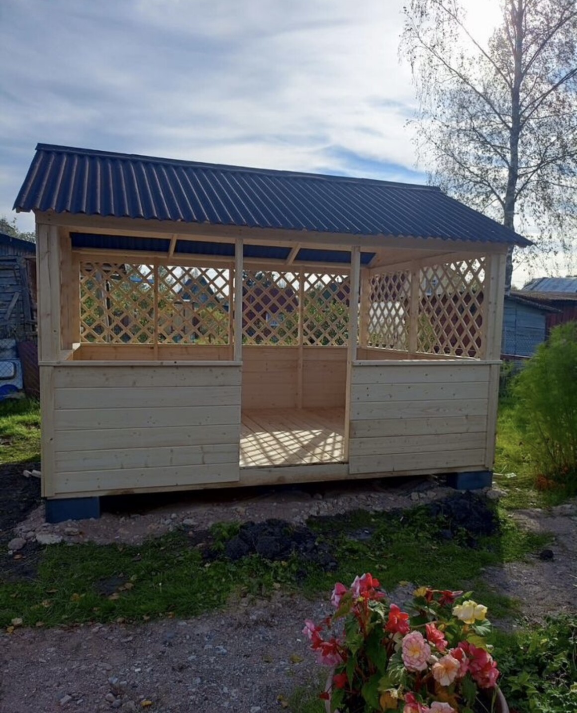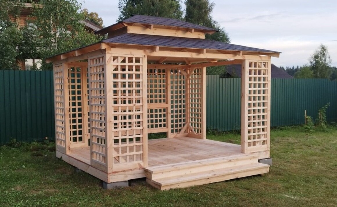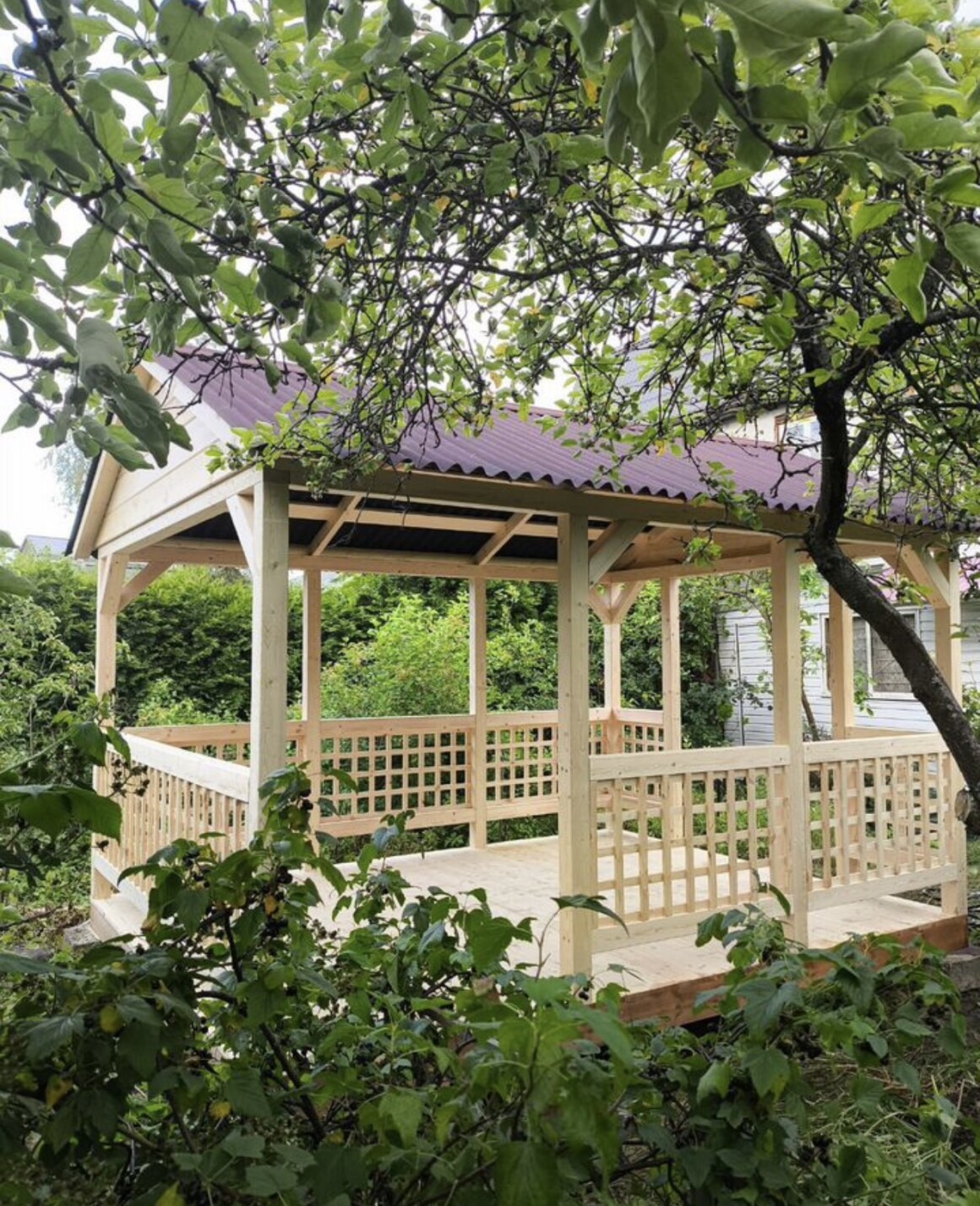 Беседки в стандартном исполнении: низ зашит решеткой. Беседка поставляется без окраски. Решетки в комплекте